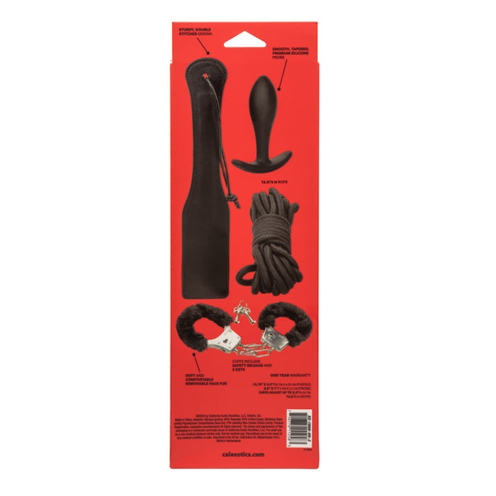Step into a world where control meets comfort with the Pleasure Kits Bondage Collection, a curated set designed to enhance every aspect of your bondage play. This collection features a sturdy, double-stitched paddle for those who love a good spank, a smooth, tapered silicone probe for delightful placement stimulation, removable faux fur cuffs for soft yet firm restraint, and 16.5 feet of rope for the ultimate binding experience.